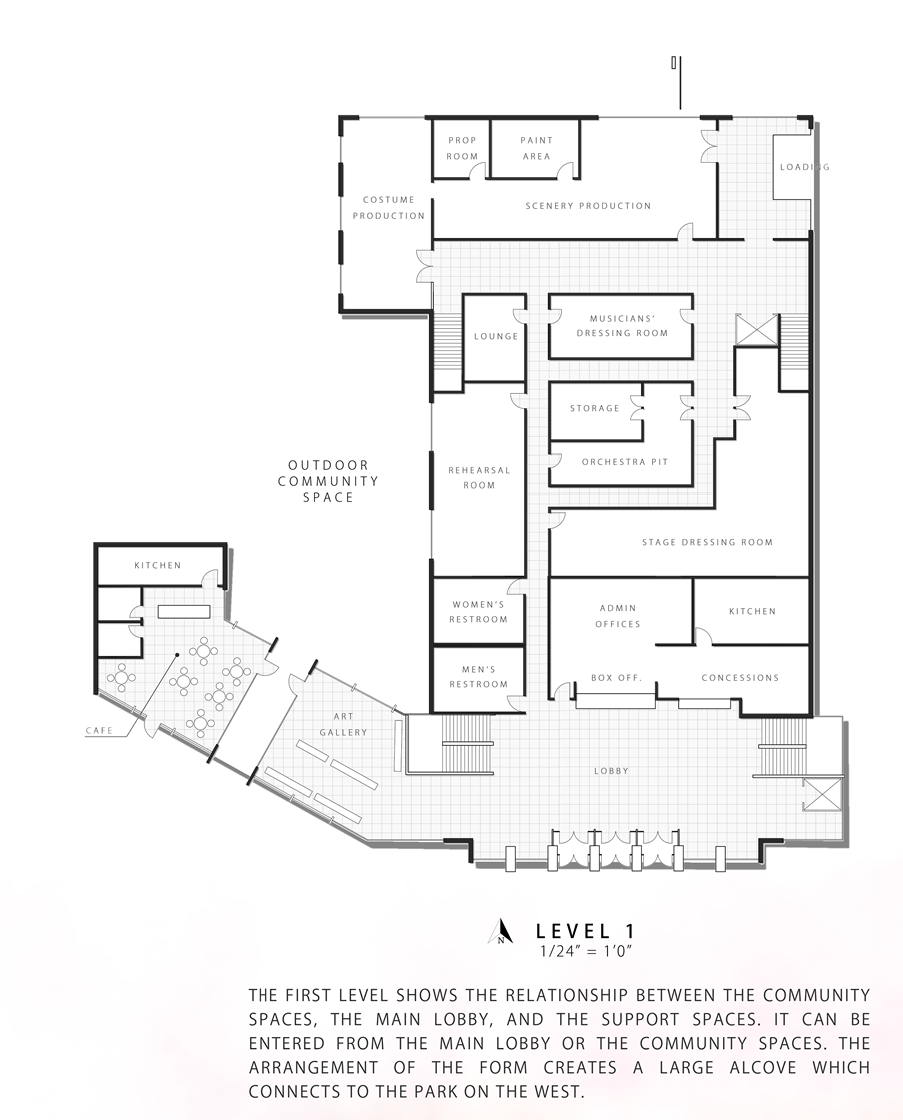At the core of this performing arts center is the balance of the performance and community functions. The placement of the massing allows the community and performance functions to be integrated, connecting informal community activities and formal performances through an open plan. The site is integrated with the planned park through a large open space on the west and a passageway on the south which allows free movement through the building's massing, blending both outside and inside. This open space on the west creates an outdoor community area where visitors from the park or elsewhere can relax, eat, and play. The south facade is opened with heavy glazing and an exposed structural system that bows out towards the street, creating a strong connection between the street, the lobby, and the community spaces inside.
